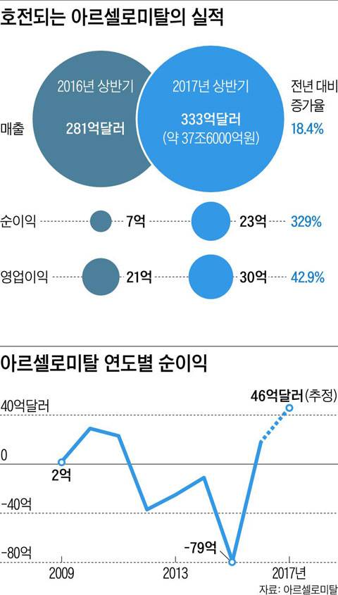 2006년 합병 이후 순조롭게 성장 2017년 들어 실적은 이 회사가 사실상 위기에서 벗어났고 있음을 보여준다. 지난 7월 말 발표된 올 상반기(1~6월) 실적에 따르면, 올 상반기 매출과 순익은 각각 333억달러, 23억달러로, 강한 회복세를 보였던 작년 같은 기간의 매출 281억달러, 순익 7억달러에 비해 각각 18.4%, 329% 급증했다. 올 전반기 영업이익(30억달러)도 작년 같은 기간의 21억달러보다 42.9% 늘어났다. 미탈 회장은 "우리는 작년과 올해 상반기에 눈에 띄는 실적 향상을 이뤘다"면서 "올 하반기에도 계속해서 순익 증가를 우선적으로 추진해 나갈 것"이라고 밝혔다.