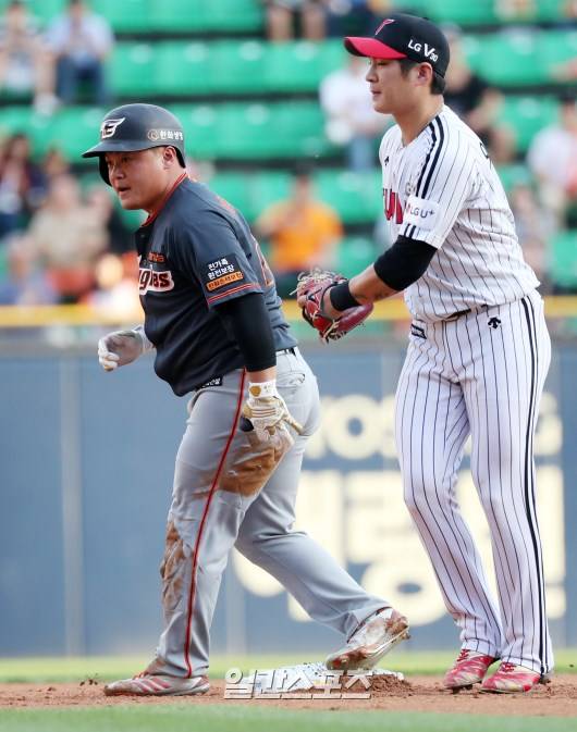 16일 잠실구장에서 열린 2017 타이어뱅크 KBO리그 LG 트윈스 대 한화 이글스 전에서 한화 양성우가 4회초 1사에서 LG 선발 차우찬을 상대로 우중간 2루타를 날리고 2루에 안착한 후 숨을 고르고 있다.