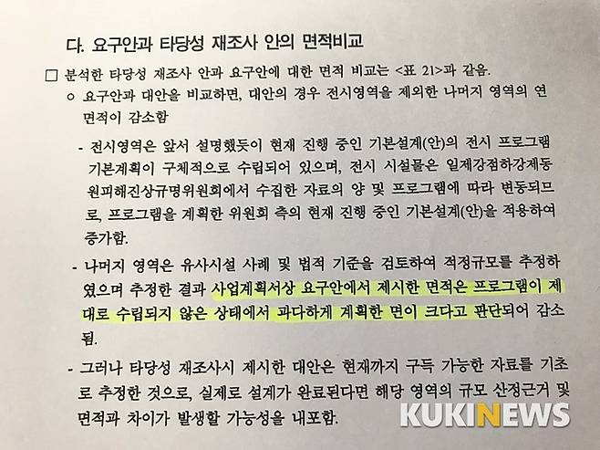 역사관 건립비용의 적정성도 문제가 됐다. 현행안과 설계안에서 책정된 사업비는 480여억원으로 동일했다. 그러나 건축 총면적은 현행안이 9785㎡, 설계안이 1만6239㎡로 6454㎡ 차이가 났다. 약 2000평이 늘어난 것이다. 위원회는 시설 면적이 증가했음에도 불구하고 건설비 증액을 요구하지 않았다. 이는 처음부터 총사업비가 지나치게 크게 배정됐음을 보여주는 방증이기도 하다.