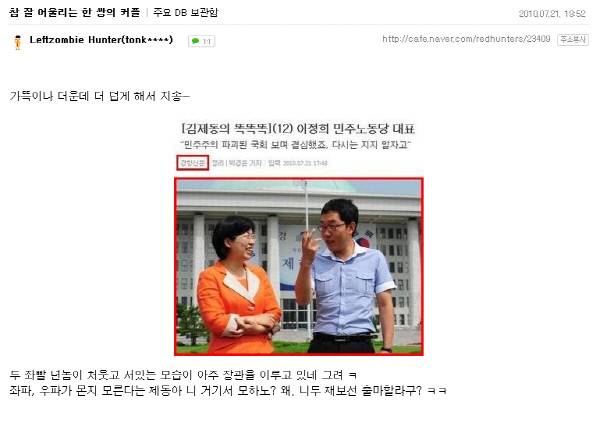 정부에 비판적인 연예인들을 비하할 때는 ‘종북’이 단골 소재였다. 2010년 7월21일 ‘참 잘 어울리는 한 쌍의 커플’이란 글에는 방송인 김제동씨(43)와 이정희 당시 민주노동당 대표(48)가 함께 등장한 언론기사 사진을 올린 뒤 “좌빨 년놈”이라는 표현을 썼다. 블랙리스트 82명에 오르지 않은 문근영씨도 “빨치산 손녀” “빨갱이 핏줄” 등의 공격을 당했다. 김구라씨(47)도 공격 대상이었다. 이 아이디로 게시된 ‘공작글’은 확인된 것만 약 200개에 이른다.