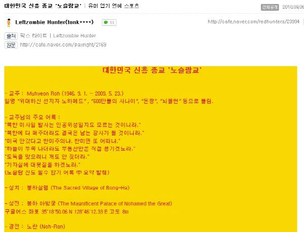 2010년 9월6일 회원수 5000여명인 포털사이트 네이버의 한 보수 성향 카페에는 해당 아이디 명의로 “대한민국 신흥 종교 ‘노슬람교’”라는 제목의 글이 게시됐다. ‘노슬람교’는 일부 보수층이 ‘노무현 전 대통령’과 ‘이슬람교’를 합쳐 비아냥댈 때 쓰던 말이다. 해당 아이디는 ‘좌빨혐오’ ‘Leftzombie Hunter’(‘좌파좀비 사냥꾼’이란 뜻) ‘Mossad’(이스라엘 비밀정보기관) 등으로 닉네임을 바꿔가면 글을 게시했다.