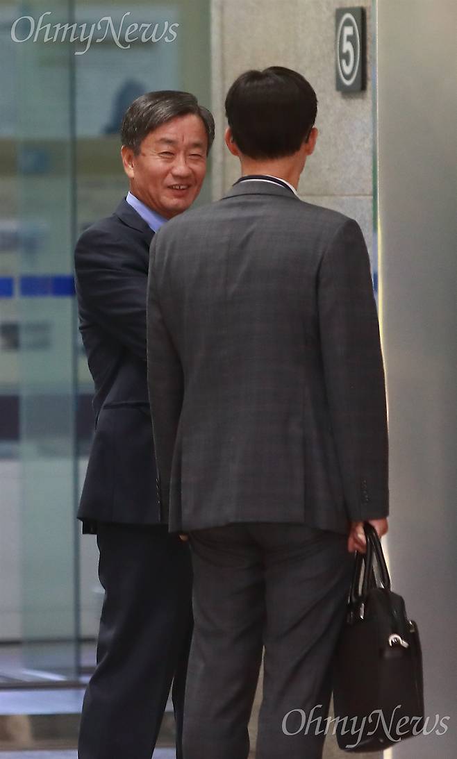 이명박 정부 시절 '국정원 댓글부대' 실무책임자로 알려진 이종명 전 국가정보원 3차장이 21일 오후 서울 서초구 서울중앙지검에 피의자 신분으로 출석하며, 팔짱을 낀 채 여유있는 웃음을 지으며 변호사와 함께 승강기를 기다리고 있다.