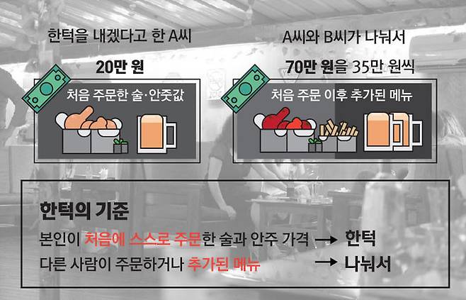 '본인이 처음에 스스로 주문한 술과 안주 가격'이 한턱의 기준이고 이후 다른 사람이 주문하거나 추가된 메뉴에 대해서는 나눠서 돈을 내야 한다는 겁니다. A 씨와 B 씨는 박 판사의 판결에 수긍하고 집으로 돌아갔습니다.