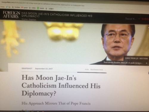 가톨릭 신자인 문재인 대통령의 대외 정책이 프란치스코 교황의 접근법을 본보기로 삼고 있다고 미국의 권위 있는 외교 전문지인 포린 어페어스(Foreign Affairs)가 22일(현지 시간) 평가했다. 이 전문지는 빅터 가에탄(Victor Gaetan) 내셔널 가톨릭 레지스터 선임 기자가 쓴 ‘문재인의 가톨릭 신앙이 그의 외교에 영향을 미치나’라는 제목의 기고문을 통해 이같이 전했다.