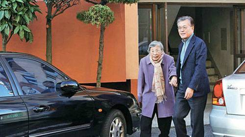 | 문재인 대통령과 어머니 강한옥 여사가 성당을 나서고 있다. 사진=가톨릭평화방송·평화신문 |