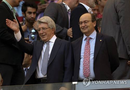 epa06221343 President of Atletico Madrid, Enrique Cerezo (L), and President of Sevilla FC, Jose Castro (R), attend the Spanish Primera Division Liga match between Atletico Madrid and Sevilla at Wanda Metropolitano stadium in Madrid, Spain, 23 September 2017. EPA/BALLESTEROS