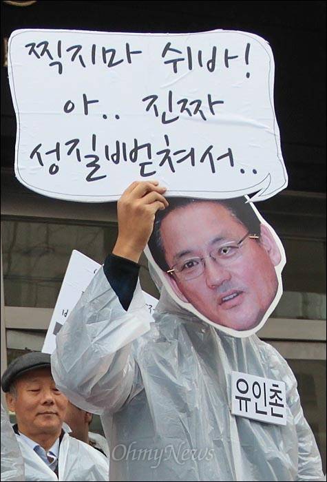 | ▲ 2011년 11월 29일 서울 중구 조선일보사 앞에서 열린 '조중동방송 신장폐업 선포 및 조중동방송 5적 발표 기자회견'에서 조중동방송저지네트워크 한 회원이 유인촌 전 문화체육관광부 장관의 가면을 쓰고 퍼포먼스를 벌이고 있다. |