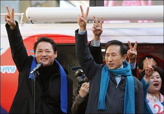 | ▲ 이명박 한나라당 대선후보와 탤런트 유인촌씨가 2007년 11월 27일 오후 대전광역시 으능정이 차없는 거리 유세에서 지지자들을 향해 손을 들고 있다. |