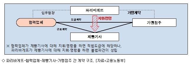 그러나 고용노동부는 파리바게뜨의 제빵사 고용 형태를 도급이 아닌 파견으로 봤다. 도급과 파견 둘 다 용역업체를 통해 원청업체에 고용되지만, 도급은 원청업체의 지휘·명령을 받지 않는 반면 파견은 이를 받는다. 고용노동부는 지난 22일 "파리바게뜨가 가맹사업법상 교육·훈련·지원을 넘어 인사·노무관리까지 직접 했기 때문에 불법파견으로 판단했다"고 밝힌 바 있다. 도급으로 보기에는 여러 개입이 많았다는 것이다.