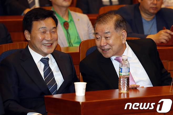 (서울=뉴스1) 안은나 기자 = 손학규 국민의당 상임고문과 문정인 대통령 통일외교안보 특보가 27일 오후 서울 여의도 국회 헌정기념관에서 열린 동아시아미래재단 창립 11주년 기념 토론회 '한반도 위기, 어떻게 해결할 것인가?'에서 대화하고 있다. 2017.9.27/뉴스1