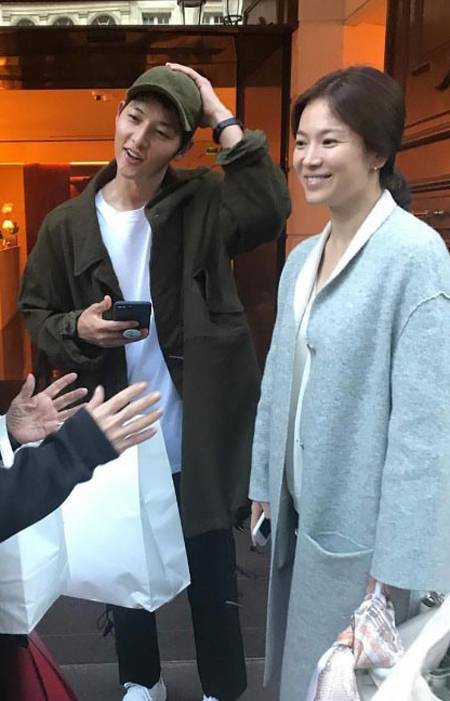 공개된 사진 속 송혜교와 송중기는 파리에서 만난 팬들과 카메라 앞에서 다정하게 포즈를 취해주며 웃고 있다.