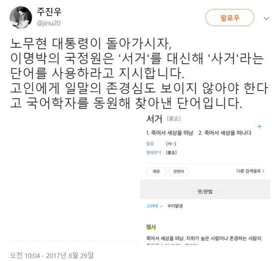 시사인 주진우 기자도 노무현 전 대통령의 서거 이후 국정원 공작에 대한 의혹을 제기했다. 주진우 기자는 지난달 28일 트위터에 "노무현 대통령이 돌아가시자, 이명박의 국정원은 '서거'를 대신해 '사거'라는 단어를 사용하라고 지시한다"라면서 "고인에게 일말의 존경심도 보이지 않아야 한다고 국어학자를 동원해 찾아낸 단어"라고 폭로했다.