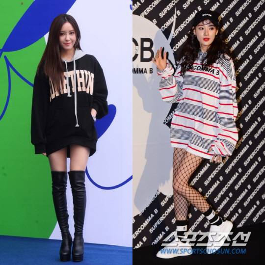효민과 이주연, 프리티한 잇 걸들은 캐주얼한 무드의 맨투맨 티셔츠, 롱 티셔츠 등을 활용해 깜찍 발랄한 하의실종 패션을 완성했다. 재킷 등 포멀한 스타일을 활용한 것이 부담스럽다면 이들의 스타일을 참고해보자.