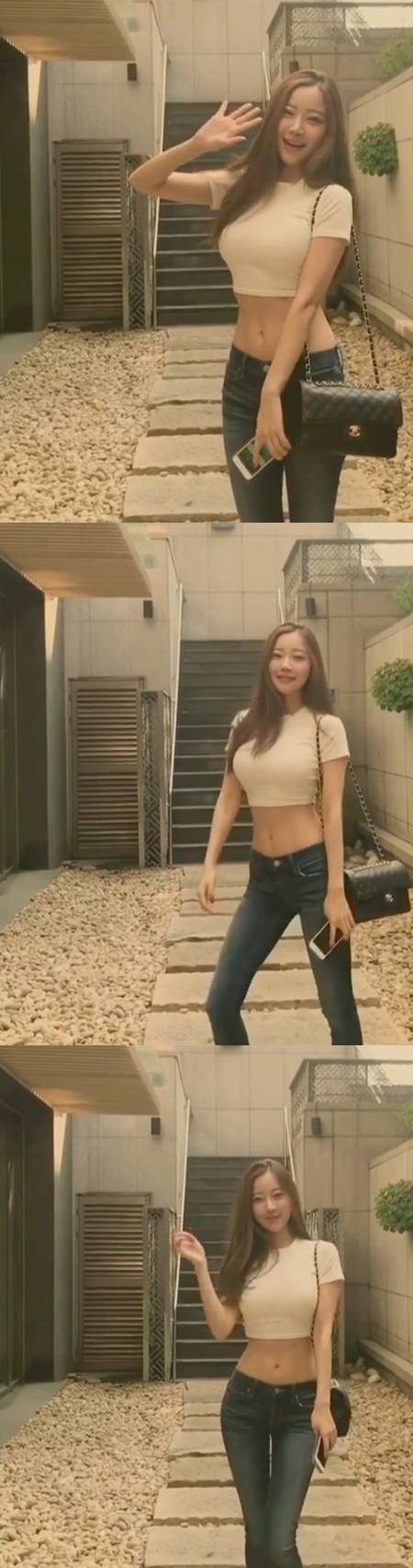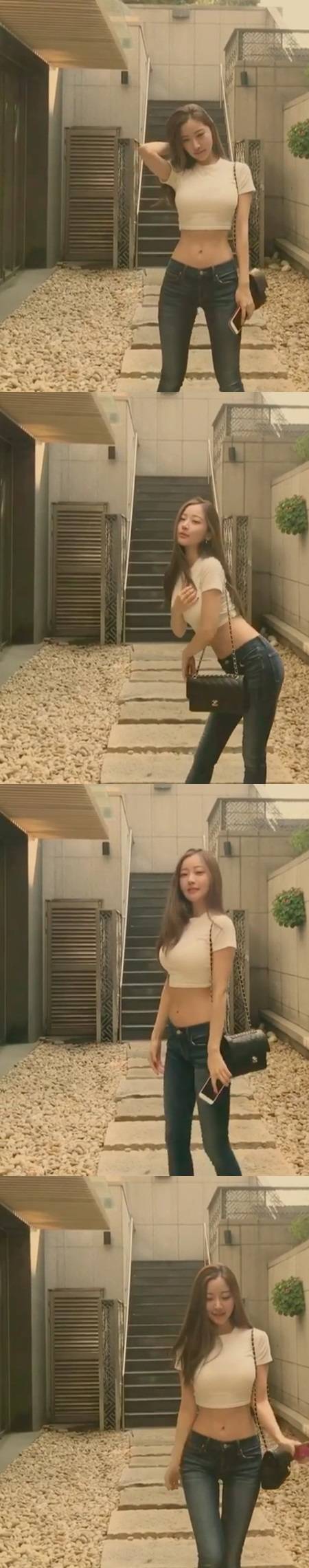 공개된 영상에는 흰색 크롭티와 스키니 청바지를 입고 무결점 S라인을 뽐내는 윤사랑의 모습이 담겼다.