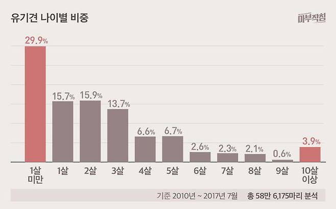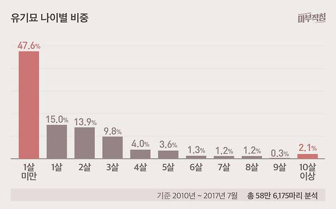 ● 유기동물의 30%는 1살 미만, 2살 이하는 60%…어릴수록 늙을수록 더 유기