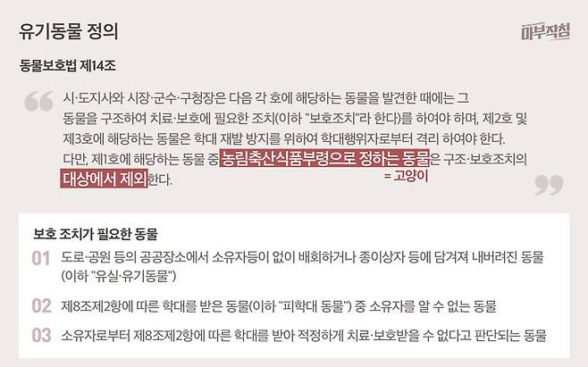 동물보호법 14조는 단서 조항을 통해 '농림축산식품부령으로 정하는 동물은 구조·보호조치 대상에서 제외한다'고 명시하고 있다, 여기서 '농림축산식품부령으로 정하는 동물'이 바로 고양이다. 자생적으로 번식하는 길고양이, 소위 '길냥이'의 존재 때문이다. 다만, 시행규칙은 '구조 신고된 고양이 중 다치거나, 어미로부터 분리돼 자생하기 힘들다고 판단된 3개월 령 이하의 고양이'는 보호소로 데려올 수 있도록 예외적으로 허용하고 있다.