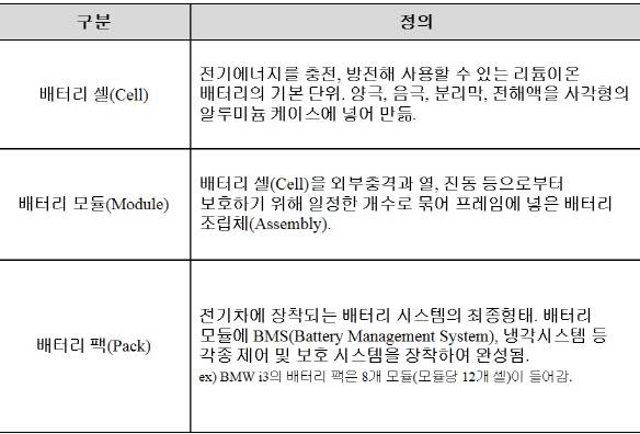 배터리의 원천은 셀에 있고, 이를 묶는 단위가 모듈-팩 순이라고 보면 된다.