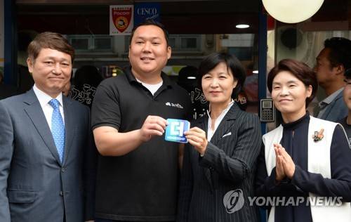 (서울=연합뉴스) 더불어민주당 추미애 대표가 3일 서울시 강서구 화곡동 당원이 운영하는 국민전통갈비에서 열린 당원가게 1호 지정식에 최재성 정당발전위원장, 한정애 의원 등과 함께 방문, 스티커를 들어보이 있다. 2017.10.3 [더불어민주당 제공=연합뉴스]