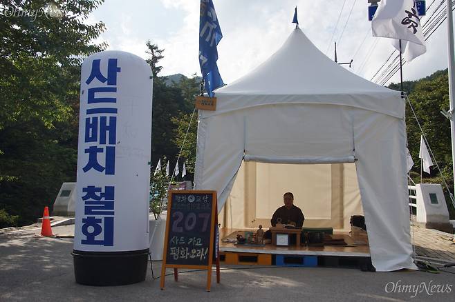 사드가 배치돼 있는 롯데골프장 부지로 올라가는 진밭교 아래에서는 원불교 교무들이 207일째 천막교당에서 강독을 하며, 지난달 19일 사드 배치 철회를 요구하면서 분신한 고 조영삼 영가의 명복을 빌고 있었다.