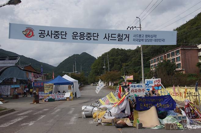 | ▲ 사드가 배치된 경북 성주군 초전면 소성리 마을회관 앞. 현수막 아래에 지난달 6일과 7일 사이 사드 배치를 둘러싸고 주민들과 경찰이 충돌하면서 부서진 천막 등이 그대로 놓여 있다. |