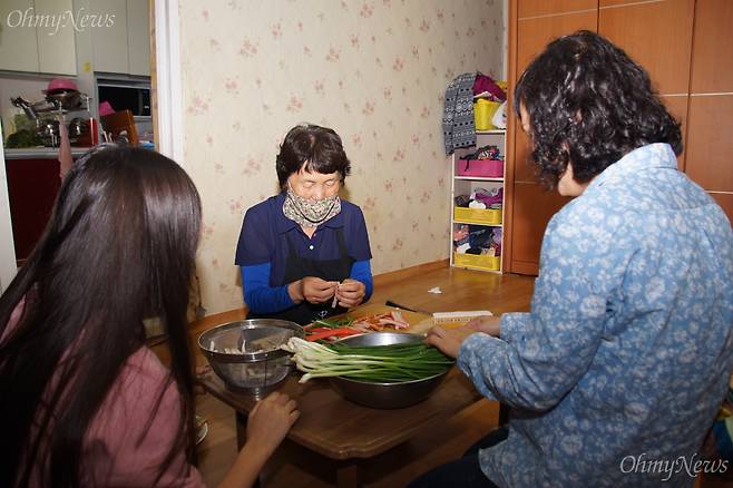 | ▲ 사드가 배치된 경북 성주군 초전면 소성리 마을에도 추석이 찾아왔다. 임분순 부녀회장이 며느리, 손녀와 함께 추석음식을 준비하고 있다. |