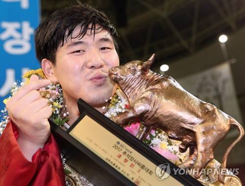 (서울=연합뉴스) 김도훈 기자 = 4일 경북 구미 박정희체육관에서 열린 IBK기업은행 2017 추석장사 씨름대회 한라장사 결정전에서 우승을 차지한 최성환이 트로피를 들고 포즈를 취하고 있다. 2017.10.4 [통합씨름협회 제공=연합뉴스]