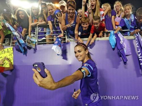 FILE - In this June 23, 2016, file photo, Alex Morgan, of the Orlando Pride, takes a selfie for a fan after the Pride beat the Houston Dash in a soccer match at Camping World Stadium in Orlando, Fla. Three Orlando City soccer players were kicked out of Disney World after officials say they became verbally aggressive with park security and other guests. An Orange County Sheriff's Office report says Orlando City Lions players Donald Toia and Giles Barnes, along with U.S. women's national team standout and Orlando City Pride star Alex Morgan, were all escorted out of Disney World's Epcot park on Sunday, Oct. 1, 2017. Toia's wife was also ejected. The report says the group began arguing with other guests and workers after Barnes cut in line at the United Kingdom pavilion's pub.(Red Huber/Orlando Sentinel via AP, File)