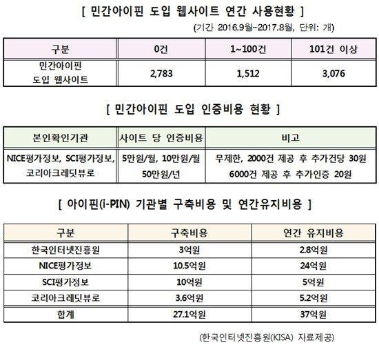 현재 민간 아이핀을 유지하기 위한 비용으로만 연간 37억원이 소요되고 있으며, 각 기업으로 부터 민간 아이핀 인증시스템을 사용을 근거로 매월 5~10만원, 연간 50만원의 비용을 받아 이를 충당하고 있는 것으로 나타났다.