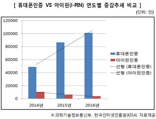지난해 아이핀 인증 건수는 공공과 민간을 합쳐도 4천6백만 건에 불과한 반면, 민간인증시스템에만 활용중인 휴대폰 인증건수는 10억 건을 넘어섰다.