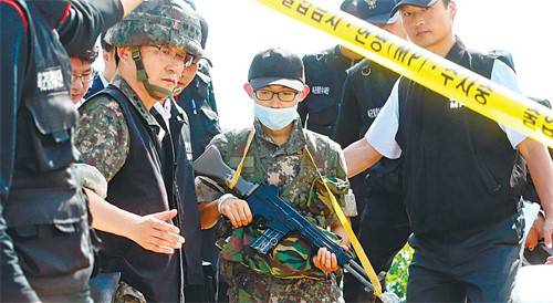 | 동부전선 GOP(일반전초) 총기난사 사건을 일으킨 임모 병장(가운데)이 사건 현장인 22사단 GOP에서 총기 난사 상황을 재연하고 있다. 자료사진 |