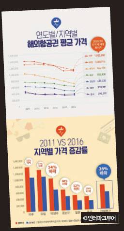 그렇다. 인터파크투어가 지난 6년간 조사한 결과 해외여행 항공권의 요금이 실제로 저렴해졌다. 그것도 26%나 말이다. 물가는 항상 오르는 것이고, 여행경비 또한 마찬가지였던 것만 같은데, 팩트 체크를 하고 싶은 팩트다. 일례로 일본 4인 가족의 항공료가 2001년에 181만원이었는데 2016년에는 124만원으로 50만원 이상 저렴해졌다는 것. 특히 괌, 사이판을 포함한 대양주 지역의 항공요금의 하락폭이 34% 정도로 가장 컸다. 이유는 저비용항공사의 증가다. 연간 해외 여행객 2,000만명 시대가 온 것도 같은 이유다. 그렇다면 과연 항공권은 앞으로도 계속 저렴해질까? 저가항공사의 활약을 기대해 본다.
