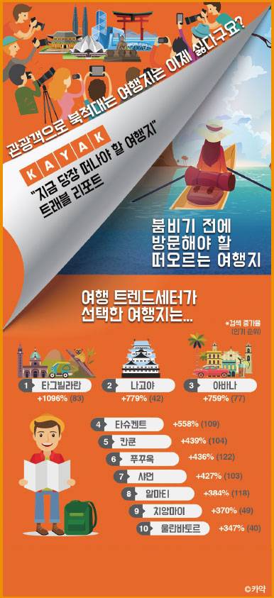 아직은 희소성 있다. 카약(KAYAK)이 ‘붐비기 전에 방문해야 할 떠오르는 여행지 10곳’을 공개했다. 수백만 건의 카약 검색 데이터를 분석한 결과, 필리핀 타그빌라란이 1위를 차지했다. 현재를 기준으로 했을 때는 한국인 여행객에게 인기 있는 여행지 중 83위에 그쳤으나, 전년 대비 검색률로 보면 무려 1,096%나 폭발적으로 증가한 것. 뒤이어 일본의 나고야(779%), 쿠바의 아바나(759%)가 각각 2, 3위를 차지했고 우즈베키스탄 타슈켄트, 멕시코 칸쿤, 그리고 베트남 푸꾸옥 등도 순위권에 올랐다. 얼른 가야 되는데 언제 가나, 괜스레 마음이 조급해진다.