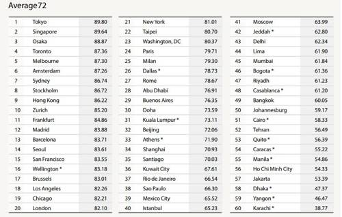 2위는 싱가포르(89.64점), 3위는 일본 오사카(88.87점), 4위는 캐나다 토론토(87.36점), 5위는 호주 멜버른(87.30점) 등이 차지했다.