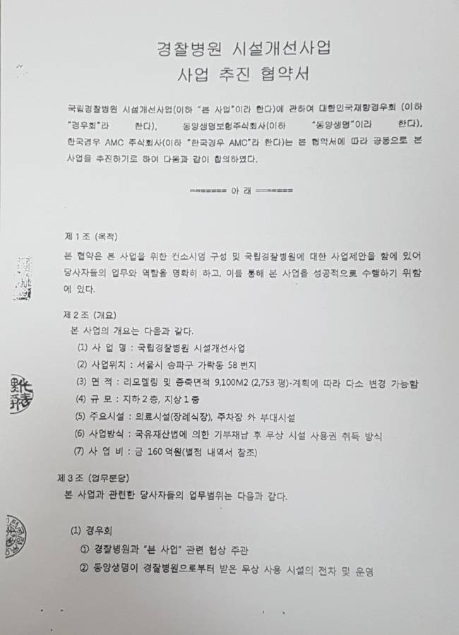 더불어민주당 김영호 의원실이 동양생명으로부터 확보한 ‘경찰병원 시설개선사업 사업 추진 협약서’에 따르면 2013년 5월 재향경우회는 구재태 전 경우회장이 대주주인 한국경우AMC, 대한민국재향경우회와 경찰병원 사업 추진 협약서를 작성했다.