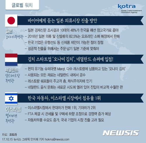 일본 오사카무역관은 "최근 트와이스 등 걸그룹 성공적 진출을 계기로 일본 10대를 중심 한국 패션에 대한 관심이 높아지고 있다"며 "중국 기업과 달리 한국 기업은 신제품 제안이 가능한 점이 장점이므로 유행을 선도할 수 있는 신제품 개발 노력 등 장점을 더욱 살려나갈 필요가 있다"고 제안했다.