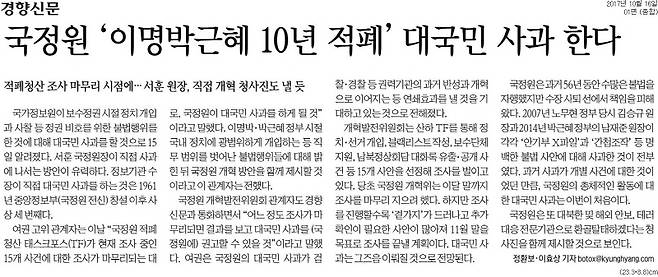 한편 이날 경향신문은 국정원이 보수정권 시절 정치 개입과 사찰 등 정권 비호를 위한 불법행위를 한 것에 대해 대국민 사과를 할 것으로 알려졌다고 보도했다.