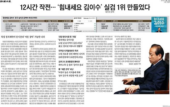 조선일보는 16일자 3면 톱 기사에서 ‘힘내세요 김이수’ 문구가 인터넷 포털과 SNS에서 확산한 것에 대해 “12시간 작전”, “특정 정치세력이 단시간 내 ‘여론 장악’ 가능한 나라”라고 깎아내렸다. 13일 밤 친문 인터넷 커뮤티에서 ‘지침’을 내리고 14일 정오쯤 김빈 민주당 대변인이 독려, 오후 2시 문재인 대통령이 페이스북 글을 올리며 ‘작전’을 폈다는 것이다.