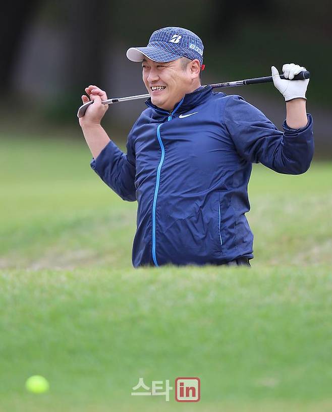 방상욱이 벙커샷 후에 껄껄 웃고 있다.