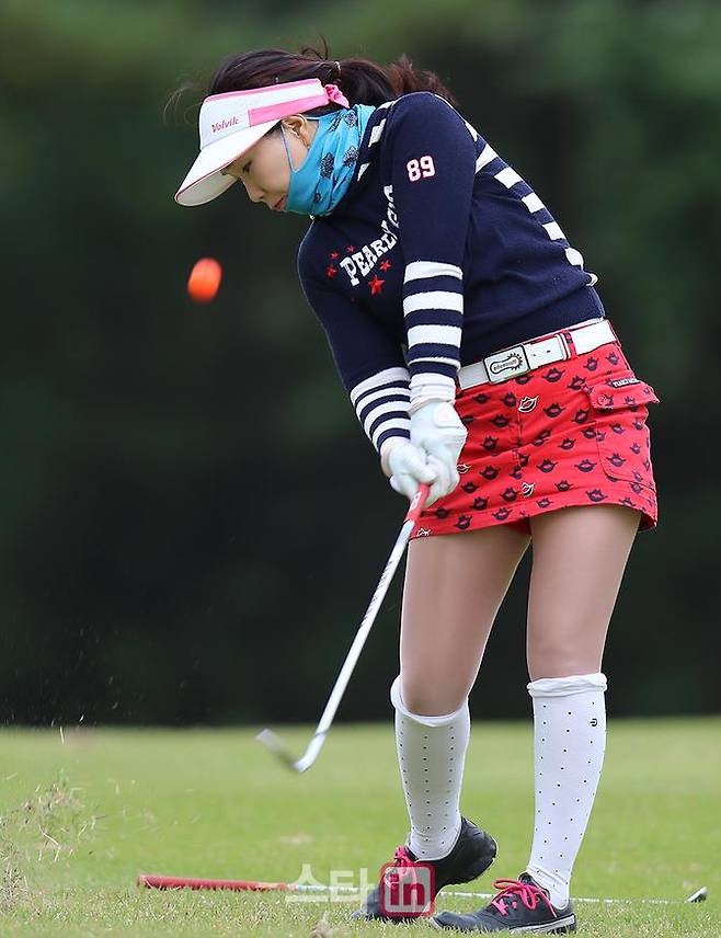 김지숙이 14번 홀에서 세컨드 샷을 하고 있다.