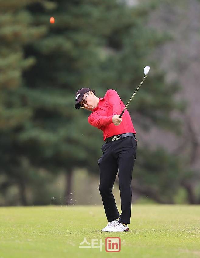 백용운이 14번 홀에서 어프로치 샷을 하고 있다.