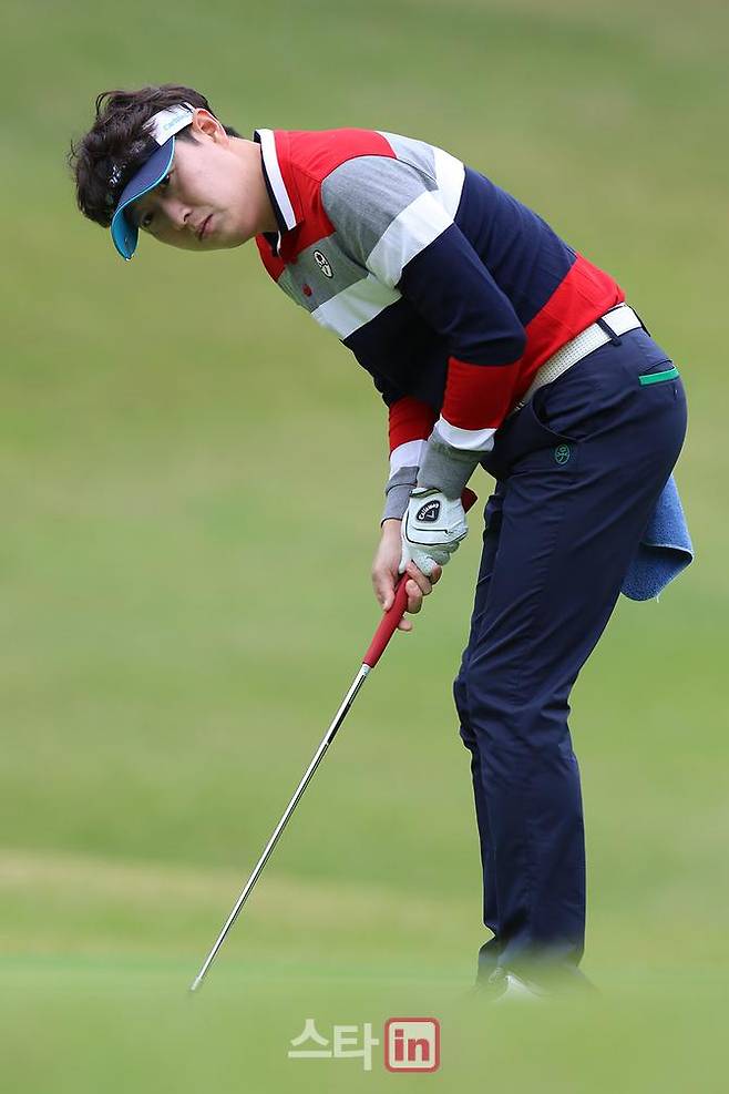 이용범이 14번 홀에서 퍼트를 하고 있다.