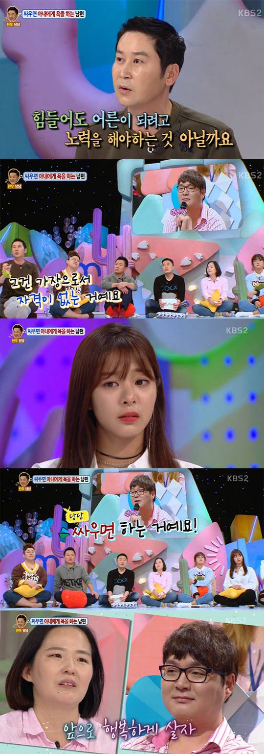 남편은 당당했다. "아무 때나 욕을 하지 않는다. 친한 친구, 친한 선후배에게만 욕을 한다. 아내와는 싸울 때만 욕을 한다"고 말했다. 정찬우는 "여자한테 욕을 하는 건 너무 하는 거 아니냐"고 지적, 하지만 남편은 "아내도 욕을 한다"고 답했다.