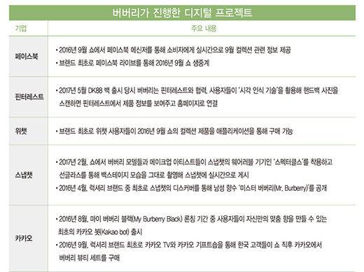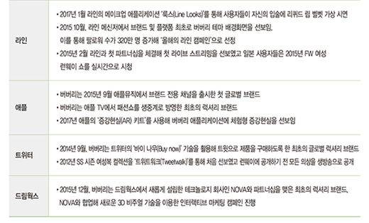 버버리는 현재 20여 개의 글로벌 플랫폼에 4900만 명 이상의 팔로워를 보유하며 소셜 미디어 채널에서 강력한 존재감을 보이고 있다. 또 페이스북·인스타그램·위챗·카카오 등 IT업계 공룡 기업들과 파트너십을 맺고 다양한 시도를 하고 있다.