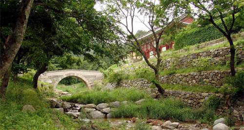 | 금강산 건봉사의 능파교(가운데 다리)와 봉서루(오른쪽). |