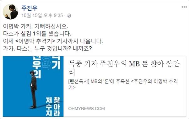 | ▲ 주진우 기자는 포털 사이트 실검에 ‘다스가 누구 겁니까?’라는 다스 관련 검색어가 1위에 올라오자, 자신의 인터뷰 기사를 링크하며 ‘다스는 누구 것입니까? 네꺼죠?’라는 글을 남겼다. |