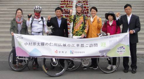 인천시 강화군과 인천관광공사는 여행 저널리스트인 나카무라 요타(中村洋太·사진 오른쪽에서 네번째) 씨가 지난 18일 자전거로 강화도를 일주했다고 밝혔다.