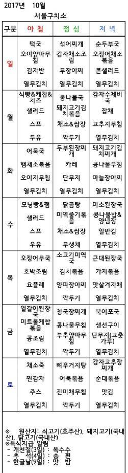 | 2005년 이후 교도소 등 모든 교정시설에는 영양사가 배치됐다. 아울러 법무부 교정본부는 한달 단위로 식단을 만들어 공개하고 있다. 여기엔 원산지 표시, 특식까지 표시돼 있다. 이는 이달 서울구치소의 식단표. |