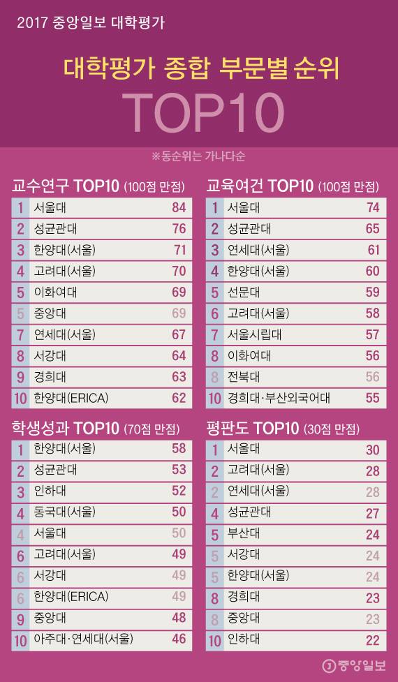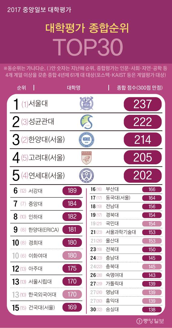서울대가 '2017 중앙일보 대학평가' 종합평가에서 1위를 차지했다. 이어 성균관대·한양대(서울)·고려대(서울)·연세대(서울)가 2~5위에 올랐다.