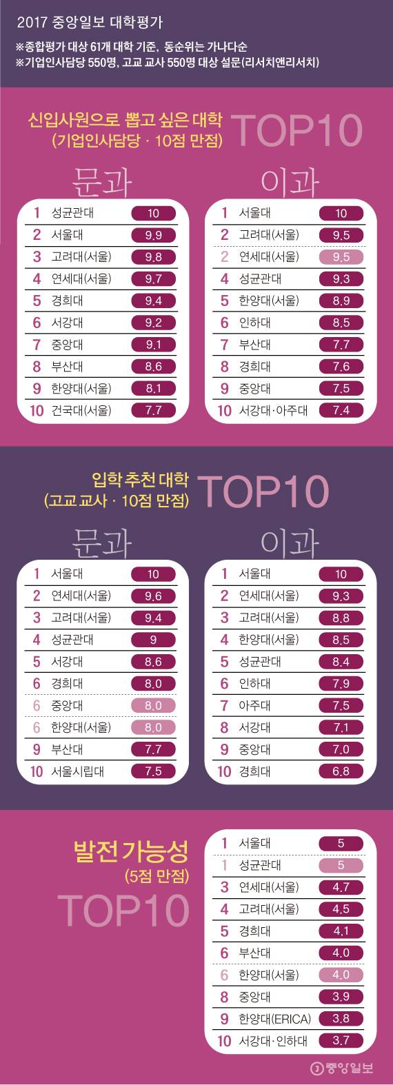 신입사원으로 뽑고 싶은 대학으로는 고려대가, 입학 추천 대학으로는 연세대가 더 좋은 점수를 받았다. 비서울권 대학 가운데에서는 대체로 인하대와 부산대의 점수가 높았다. 한편 4개 계열평가에서는 인문계열과 사회계열에서 서울대가 1위를 차지했다. 자연과학계열에서는 KAIST가 1위였고, 공학계열은 성균관대와 포스텍이 공동 1위다.