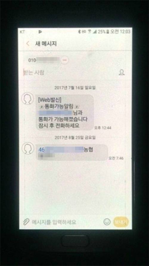 주민 A씨는 사흘 뒤 자신의 농협 계좌번호를 문자로 막내아들에게 보냈다.
